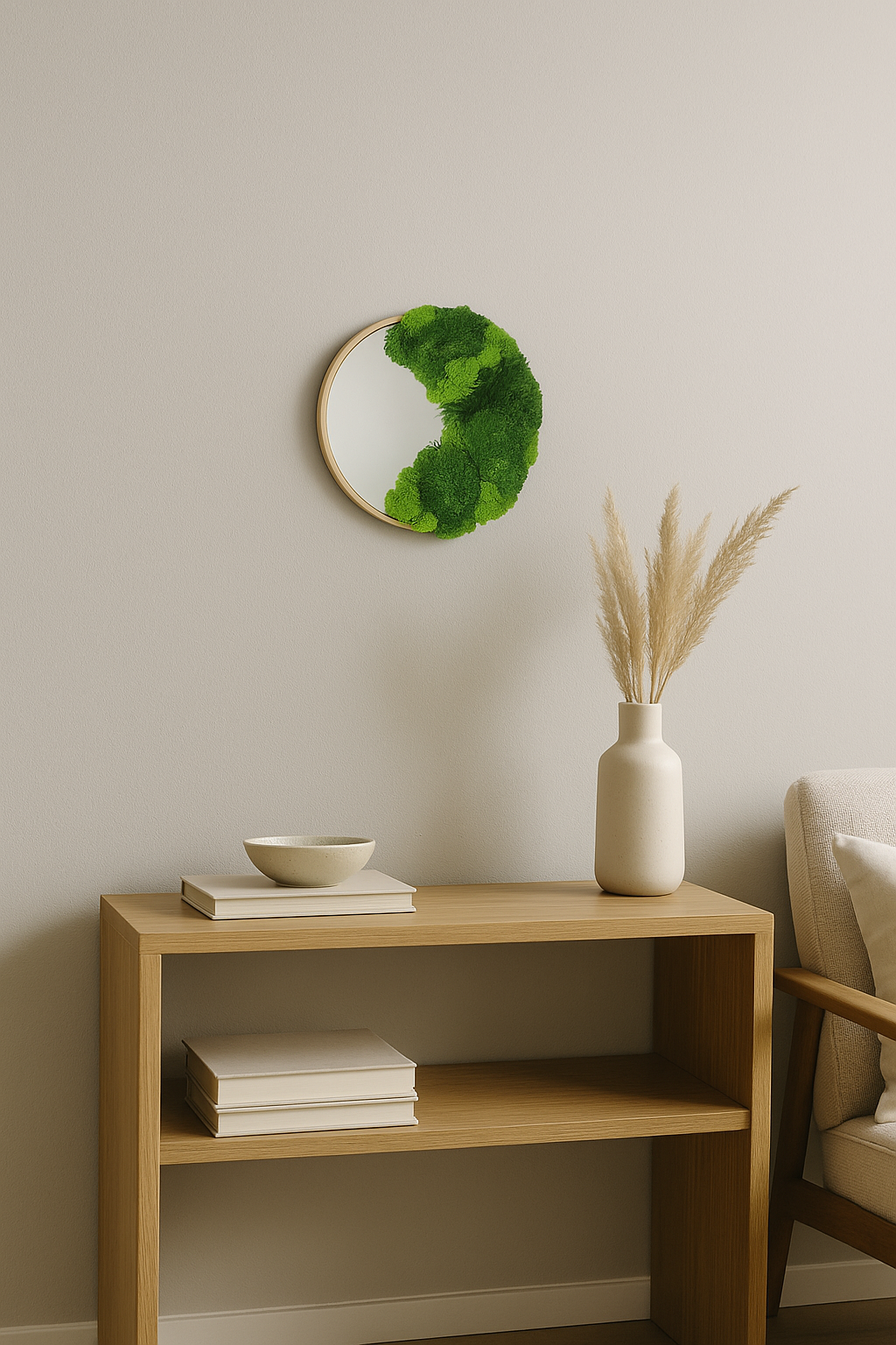 Perfekte Balance: Das Moos schmückt dezent das seitliche Drittel des Rahmens und lässt den Spiegel selbst als klaren Mittelpunkt des Designs erstrahlen – eine harmonische Verbindung von Natur und modernem Stil.